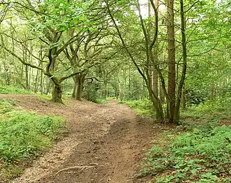 The country park covers 200 acres (0.81 km2), consisting mainly of pine and broad leaved woodland with some heaths and a small section of grassland. The woodland stretches over a terrain of hills and cliffs, with many sandy paths crisscrossing the lower woodland—some even going up cliff outcrops and across to a middle section between the woodland floor and clifftops—and the main paths leading up to the cliffs, which are also dominated by woodland.