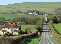 ![]() Approach to the village and St Mary's church; Whitepits in background | |