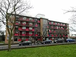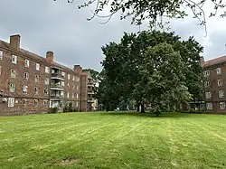 Constructed in the 1950s the estate’s architecture is an unusually late example of brick modernism, typical of the pre-war style associated with the architect Willem Marinus Dudok.[3] The slightly anachronistic design of the housing can be attributed to idiosyncrasies of the bureaucratic allocation of departmental responsibilities within the LCC. However, despite contemporary criticism of the design of other LCC developments, Kingswood Estate has been highly regarded, with the Dulwich Society noting that “there can be fewer public housing schemes where so much care and thought has gone into the design“.[4]