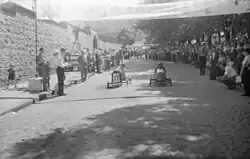 The first Kinsmen Coaster Classic was held on October 8, 1938, with fifty-six boys running as either class B (ages 9–12) or class A (ages 13–15) entries. Before a crowd of an estimated four- to five-thousand, eleven-year-old Bill Telfer, driving his stout-built "Thunderbolt," defeated class A winner Leonard Applebaum, 14, in the final, becoming the first Kinsmen Coaster Classic champion.[12] Award-winning Québécois photojournalist Conrad Poirier was present to document the event (pictured). Cars from the race were put on public display at the Eaton's Toyville on the forth floor, including Telfer's winning "Thunderbolt," and racers by Best Looking Car Award winners Hans Gruninger and Earl Mackintosh.[13] The following year the race took place in Montreal's east end under an afternoon shower, with class A entry Sydney Wright, 14, taking the top prize, and Gus Mell, 12, winning in the class B category. Bill Telfer returned in his "Thunderbolt" and was cheered on by the crowd as he clocked an excellent time while testing the track, but after the rain began his car became hampered, and he lost to Mell in the semi-final round.