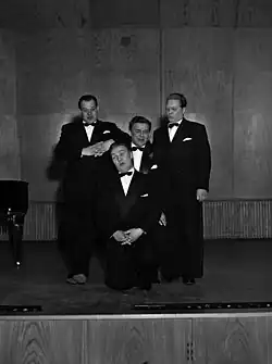 The quartet was first brought together for the 1950 musical comedy film Beautiful Veera to voice the singing crew of a steamboat, under the direction of Bergström. Only Olavi Virta was seen on screen; Teijo Joutsela, Auvo Nuotio and Kauko Käyhkö only lent their voices. Due to the film's success Bergström formed a real quartet that debuted the following year.[3][4][5][6][7]