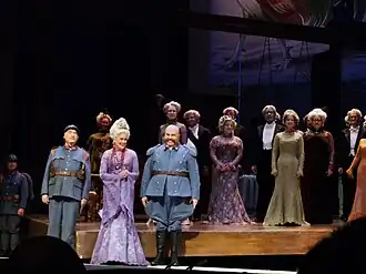 In April 2010, Te Kanawa sang the Marschallin in Der Rosenkavalier in two performances at the Cologne Opera. That same year, she played the spoken role of The Duchess of Krakenthorp in Donizetti's La fille du régiment at the Metropolitan Opera, and sang a tango. She repeated this role at the Met in a revival during the 2011–12 season, repeating it again in Vienna in 2013 and at Covent Garden in March 2014, a run that encompassed her 70th birthday. In the meantime, she performed at Haruhisa Handa's inaugural Tokyo Global Concert at Nakano-Zero Hall in Nakano, Tokyo, Japan, on 10 September 2013.[38][39] In October 2013 she appeared in the role of Nellie Melba in the television series Downton Abbey.[40]