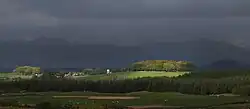 Shennanton. View across open farmland at Shennanton. Cairn in front of tall trees. -