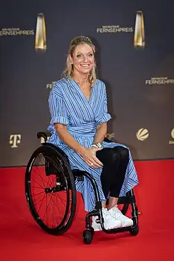 The 2014 European Championships marked Bruhn's final competition.[7] After retiring from sport, Bruhn worked as an ambassador for rehabilitation, prevention, and sports at Unfallkrankenhauses Berlin (Berlin Accident Hospital).[8] In 2015, she was elected chairperson of the board of trustees of the German Disabled Sports Association (DBS).[9] Her autobiography, Mein Leben und wie ich es zurückgewann (My Life and How I Won It Back), was published in 2016.[10][11] She was appointed to the expert committee of Deutsche Sporthilfe in 2024.[8]