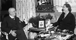 Having received repeated and cryptic cablegrams from her husband, who had returned to Norway a year and a half earlier, Flagstad was forced to consider leaving the United States in 1941. Though dismissing the political implications of the departure of someone of her fame from the United States to German-occupied Norway, it was nonetheless a difficult decision for her. She had many friends, colleagues, and of course many fans all over the US. Even more importantly, her 20-year-old daughter Else had married an American named Arthur Dusenberry and was living with her new husband on a dude ranch in Bozeman, Montana. It was Edwin McArthur who gave the bride away at the wedding in Bozeman a year earlier. Nonetheless, against the best advice of her friends and colleagues, including former president Herbert Hoover, who pleaded with her to stay out of Europe, she returned to Norway via Lisbon, Madrid, Barcelona, Marseille, and Berlin in April, 1941.[5]