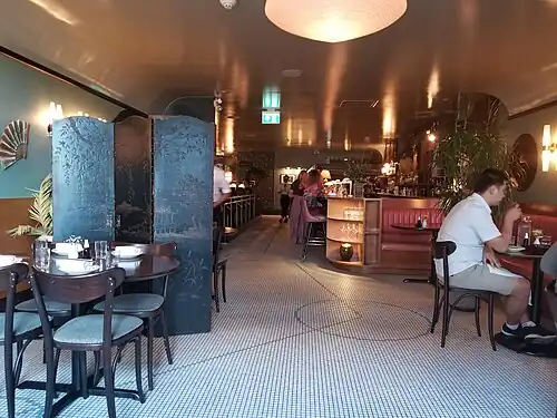 The restaurant's interior is inspired by the mid-century modern design movement, also paying homage to the work of Italian architect Gio Ponti.[6][8] Aesthetically, it references the jazz cafes which inspired its name, with specific homage to the famous Hotel Okura Tokyo.[3][4] The coved ceiling, with high-gloss paint, is characteristic of those cafes.[8] The pixellated design of the floor tiling draws inspiration from the John Gall paperback covers of Haruki Murakami novels.[2] Food critic Pete Wells of The New York Times compared the color palette, which incorporates raspberry, blue-green, and royal blue, to that of a David Lynch film.[5][13] Mid-century decorative elements include curved banquettes, banker's lamps, extensive use of maple and walnut, and polished brass fixtures.[3][13][20] A raised, oversized dining booth called "the hot tub" by staff dominates the rear of the restaurant.[21] Vinyl records and knick-knacks are stacked on dark wood shelves behind the bar, replacing the traditional mirror-backed bar.[2][20]