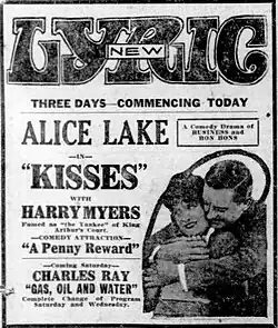 Kisses is a 1922 American silent comedy film directed by Maxwell Karger and starring Alice Lake, Harry Myers and Edward Connelly.[1]