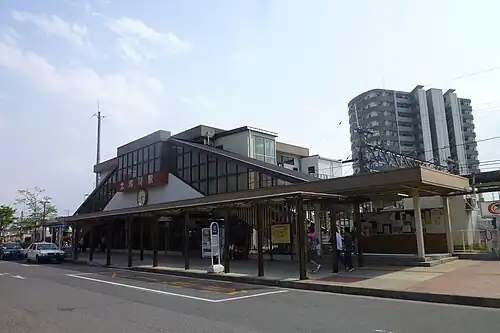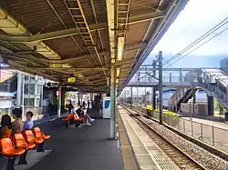 The station has a single island platform serving two tracks, with an elevated station building located above the platforms. The station is staffed.