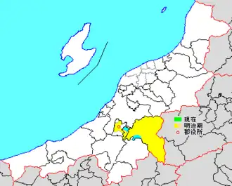 * yellow - areas formerly within the district borders during the early Meiji period