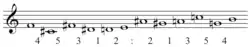 Analyses of the pitch material have fallen broadly into two camps. One, initiated by Robin Maconie,[33] holds that the piece is constructed from chromatic tetrachords; the other, founded by Dieter Schnebel[34] and continued by Jonathan Harvey,[35] maintains that the basis is actually a five-note set, consisting of that same tetrachord plus a note a minor third above (0,1,2,3,6), and ordered as a series: A, B, D, A, B, in a "succession of 5 proportions [that] runs subcutaneously through the whole piece".[34] In a passing reference to this piece, the Dutch composer Ton de Leeuw presents these same five notes in ascending scale order, which he describes as "rudiments of the 12-note series", but does not explain whether his diagram is to be understood as an ordered row or an unordered collection.[18] This same set, treated as unordered, has been taken as a starting point for a lengthy analysis by David Lewin,[36] while Christoph von Blumröder has published one nearly as long favouring Maconie's view.[37] One reviewer has judged Blumröder's analysis as a conclusive demonstration that the tetrachord is in fact the compositional basis, while conceding that Harvey and Lewin's view remains a valid construal of the piece viewed as a finished product.[38]