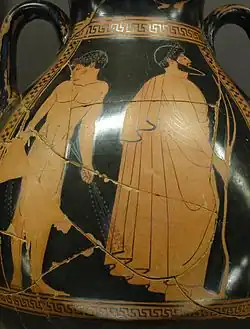 However, in 1981 John Boardman demonstrated that the signature on the vase was a modern forgery, and the Kleophrades Painter returned to anonymity.[1] The Kleophrades Painter is thought to be the son of the potter Amasis, and the pupil of Euthymides, as his earliest work greatly resembles that of his master. He himself had pupils, which include the Berlin Painter and also the Boot Painter. Overall, the Kleophrades Painter is recognized as one of the greatest pot painters in the late Archaic period in Athens.