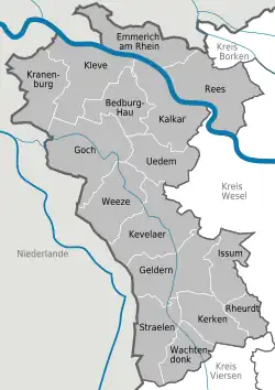 NetherlandsKrefeldBorken (district)Viersen (district)Wesel (district)Bedburg-HauEmmerich am RheinGeldernGochIssumKalkarKerkenKevelaerKleveKranenburgReesRheurdtStraelenUedemWachtendonkWeeze