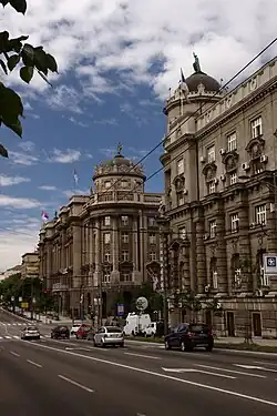 - Intersection with Nemanjina; Building of the Government Building; projected by Nikolay Krasnov, built 1926–28, upgraded in 1938. Originally, the Finance Ministry.[20]