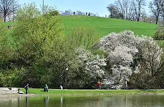 Following the end of the Second World War, beginning in the 1940s, five multifamily residential neighborhoods were developed in the area.[9] During that time was also formed the Moczydło Mound, an artificial hill, with a height of 130.5 m, made from the rubble of destroyed buildings, brought from all around the city.[13][14] In the 1960s, it was covered in dirt and was also developed the Moczydło Park, which also included the Olimpia Sports Club complex.[15]