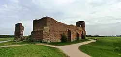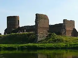 Koło Castle - a Gothic castle, which according to Jan Długosz was raised by Casimir III the Great before the year of 1362 (when Koło received its town rights). The castle secured the route from Greater Poland to Łęczyca, in the lowlands of the River Warta. The castle is located on an artificial hill on a meander of the River Warta. During the raising of the castle, the river had a number of tributaries in the area, which were important for the castle's strategic location.[1]