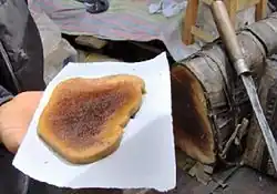 Part of the Malagasy cuisine of Madagascar, koba akondro ([kubaˈkundʐʷ]) is sold in marketplaces and gas stations by vendors. It is made by wrapping a batter of ground peanuts, mashed bananas, honey and corn flour in banana leaves and steaming or boiling the small cakes until the batter has set.[1][2] Peanut brittle is also sold.