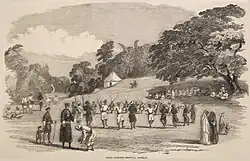 The whole family assembles in the "Mand" (open ground), where physical contests and sports, including marksmanship, are conducted.[29] In the past the hunting and cooking of wild game was part of the celebration, but today shooting skills are tested by firing at a coconut tied onto the branch of a tall tree. Traditional rural sports, like grabbing a coconut from the hands of a group of 8–10 people (thenge porata), throwing a stone the size of a cricket ball at a coconut from a distance of 10–15 paces (thenge eed), lifting a stone ball of 30–40 cm lying at one's feet and throwing it backwards over the shoulders, etc., are now conducted in community groups called Kodava Samajas in towns and cities.[3][30]