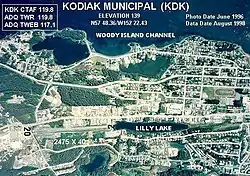 Kodiak Municipal Airport (IATA: KDK[2], ICAO: PAKD[3], FAA LID: KDK) is a city-owned public-use airport located two nautical miles (4 km) northeast of the central business district of Kodiak, a city on Kodiak Island in the U.S. state of Alaska.[1]