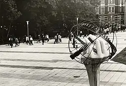 Sculpture "Hand with chip" at the entrance of VEB Mikroelektronik "Karl Marx" Erfurt