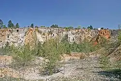 Golden Horse hill conceals the most extensive cave system in Bohemia, accidentally discovered after a nearby blast in a limestone quarry in 1950. They were subsequently made accessible for the public in 1959.[2] Spanning two kilometers and three levels, the cave system inside the Zlatý kůň hill consists of passages and domed chambers interconnected by shafts developed in limestone of the Devonian age. The caves were formed by a small stream at the end of the Tertiary period, as well as rainfall that seeped through cracks in the limestone, resulting in rich speleothem formations from an abundance of stalagmites and stalactites as well as little sinter lakes. A tour leads visitors through the upper and middle levels of the cave system. The most beautiful area is deemed by experts to be the extensive Prošek chamber with its sinter Jezírko lásky (Little lake of love). The cave also offers the spectacular "Koněprusy Roses", a sight that cannot be found anywhere else in the world. They were formed by calcium carbonate dissolved in water, which then gradually precipitated on the walls of the underground lake in the shape of bushes, the tips of which later fell away to create an unusual formation reminiscent of rose blooms.
