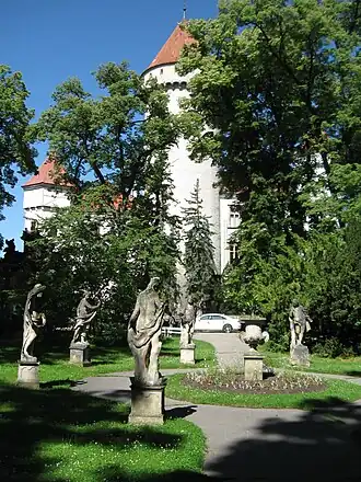 In 1603, the estate was purchased by Dorota Hodějovská of Hodějov, who made Renaissance alterations to the old gothic fortification.[2] The Hodějovský family fortified their property because of their active participation in the Bohemian Revolt in 1620. Albrecht von Wallenstein acquired the castle, and after him it was passed to Adam Michna of Vacínov. Michna gained notoriety through his repression of the serfs, who revolted against him and conquered Konopiště in 1657.