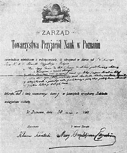 - ^ "Sprawozdanie z czynności Towarzystwa Przyjaciół Nauk Poznańskiego z roku 1883". Poznańskie Towarzystwo Przyjaciół Nauk (in Polish). Poznań: 10–11.