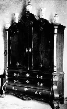 The house contains several armoires, of which Dorothea Fairbridge,[26] believes the finest is a rococo cabinet (height 270 cm, width 220 cm, depth 72 cm) of stinkwood with amboyna. It is gable-topped with flat spaces on which would have been placed blue Nankin or Delftware garnitures. It rests on claw feet and retains its original silver escutcheons and handles by Daniel Heinrich Schmidt, a Cape silversmith. The handles date the cabinet to between 1780 and 1790.[28] This cabinet might be one of three that belonged to Hendrik de Wet at the time of his death in 1802,[28] but it was certainly in its present upstairs bedroom location when Margaretha de Wet died.[26] The armoire, listed in the 1913 sale catalogue as lot 2308, was purchased for £100.[20]