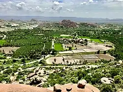 From top-left: Stone Ratha at Vittala Temple in Hampi, view of Hampi from Anjeyanadri Hill, Mahadeva Temple at Itagi, Koppal Fort, Navalinga Temple at Kuknur
