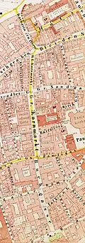 Construction of the new road began from the west. Many houses in the old town fell victim to this project, including historically significant buildings such as the Nürnberger Hof and the Rebstock Hof on the market square. In Buchgasse, the houses Zum Goldstein and the Baseler Hof were also demolished. Cross streets like Schöppen-, Pauls-, Römer- or Kälbergasse even disappeared completely from the Frankfurt city map. The new street, named Bethmannstraße, roughly followed the course of the previous Schöppengasse and Paulsgasse. Along Bethmannstraße, the imposing buildings of the new city hall were built between 1900 and 1908, designed by architects Franz von Hoven and Ludwig Neher. These buildings, located on the east side of Kornmarkt and Buchgasse, were crowned by the two city hall towers Langer Franz and Kleiner Kohn on Buchgasse.[10]