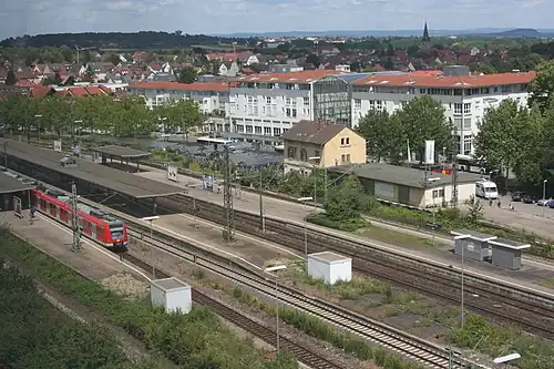 Kornwestheim station is located in the Ludwigsburg district of Kornwestheim in the German state of Baden-Württemberg. It is located on the Franconia Railway (German: Frankenbahn) and is a station on the network of the Stuttgart S-Bahn. It is near the junction of the Untertürkheim–Kornwestheim line (Schusterbahn) freight bypass. Kornwestheim passenger station was the site of a Deutsche Bahn car train loading facility until December 2007.