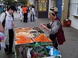 A vendor selling Koryo-saram cuisine in Almaty, Kazakhstan. Two dishes closest to the camera are morkovcha (2007)