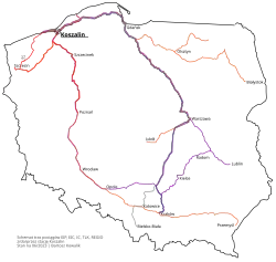 Access to Koszalin is possible from many major cities in Poland. There is direct access from Gdańsk, Warsaw, Kraków, Wrocław, Katowice, Szczecin, Łódź, Kielce, Opole, Radom and many more cities.[2] Koszalin has a direct connection with the Szczecin-Goleniów airport thanks to the use of modern hybrid trains.[3] PKP Intercity runs many year-round connections and additional connections in the summer season, which make it easier for travelers to get to Koszalin and Baltic Sea.[4] In the summer season, the city of Koszalin, in cooperation with Polregio, runs daily trains on the route Koszalin - Mielno Koszalińskie - Koszalin.[5][6]