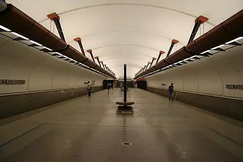 Kozhukhovskaya (Russian: Кожуховская) is a station on Moscow Metro's Lyublinsko-Dmitrovskaya line. Named after the district it is located in, the station was opened on December 28, 1995 as part of the first stage of the Lyublinsky radius. The station is a single vaulted design with a back vault to accommodate for the additional hydroisolation required.