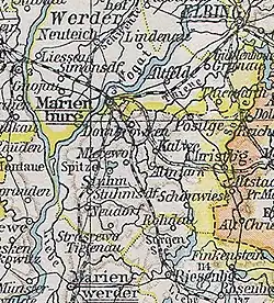 The area of the Stuhm district was annexed by Prussia during the First Partition of Poland in 1772 and belonged to the Marienburg district until 1818.[1] As part of a comprehensive district reform in the province of West Prussia, the new Stuhm district was formed on 1 April 1818 from the southern part of the Marienburg district. It comprised the towns of Christburg and Stuhm.[2]