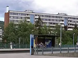 Kringsjå is a rapid transit station of the Oslo Metro's Sognsvann Line. It is situated Kringsjå neighborhood of the Oslo, Norway, borough of Nordre Aker. Located 8.4 kilometers (5.2 mi) from Stortinget, the station is served by Line 5 of the metro every fifteen minutes. Travel time to Stortinget is fifteen minutes.