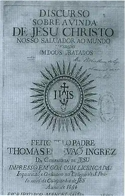- Discurso sobre a vinda do Jesu-Christo Nosso Salvador ao mundo, dividido em dous Tratados, pelo Padre Thomaz Estevão, Inglez, da Companhia de Jesu. Impresso em Rachol com licencia da Santa Inquisicão, e Ordinario no Collegio de Todos os Santos da Companhia de Jesu Anno 1616.[1] First edition, Rachol [Raitur], Goa, 1616. [Roman script.]