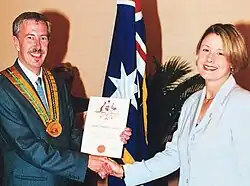 On 3 December, Keneally narrowly defeated Sartor by two votes to become the Right's candidate in a leadership spill against Rees. Later that day, she defeated Rees in a party room ballot with a majority of 45–21.[33] On 4 December 2009 Keneally was sworn in as the 42nd (and first female) premier of New South Wales by the State Governor, Marie Bashir.[34] For the first time in Australian history, both the Premier and Deputy Premier (Carmel Tebbutt) of a state were women.
