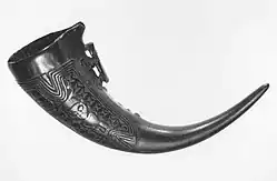 The Kuba kingdom was located in what is known today as the Democratic Republic of Congo. The kingdom was known for their supernatural powers and spiritual beliefs. Like many kingdoms, royalty was one of the most important parts. Besides having one ruler, they had 19 other rulers underneath the king that managed the 19 groups in Kuba. One of the many ways that these kings showed their status and power was by the amount of money they spent. When it comes to drinking horns, kings would give them out to their family and friends to show their wealth and generosity. Drinking horns were one of the many objects that showed class. The more elegant and intrinsic the design, the higher in society they were.[4] The patterns and material made for the drinking horn was an important aspect to show status. Drinking horns were typically used to drink palm wine. The intake of this beverage is an example of something that was done with events held by the king. This may also be an event in which the king shows his generosity and hands out gifts. The drinking horn is in the shape of a buffalo horn that symbolizes the status of the warrior that received it. The design of the horn includes patterns that are in a geometrical shape, a crocodile, and a hand.[5] This specific drinking horn has an attachment made out of iron that can be attached to a belt that the warrior would wear. The fact that the drinking horn has this accessory and option to be attached to a belt shows a high level of status within not only the Kuba society, but also the warrior community.