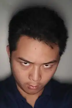 The Kubrick stare is a technique used to portray insane or unstable characters in film.[2] In a Kubrick stare, an actor looks out from under the brow line and tilts their head towards the camera.[3] Actors often use the stare to foreshadow something "intense".[1] Deemed "one of cinema's most recognizable shots" by The Daily Telegraph,[4] the technique is named after Stanley Kubrick, who often used it, but it has also been used by other directors before and since.[4] The term was coined by cinematographer Douglas Milsome to describe one of Alex's facial expressions in the Kubrick film A Clockwork Orange (1971).[5]