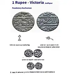 Kuchaman feudatory mint was one of the six licensed mints of Jodhpur state including Sojat, Pali, Merta, Nagaur and Jodhpur.[17] The only Thakur of Jodhpur State to have been allowed to mint was the Thakur of Kuchaman. Only silver coins were minted for the first time in 1788, the pieces being rupee, half rupee and quarter rupee.[18]
