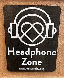 ![]() KultureCity venue sign advising those with Sensory processing disorders that they may need to wear noise cancelling headphones | |