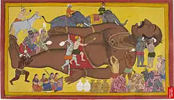 Lakshmana and Kumbhakarna dueled for a long period, leaving both of them exhausted.[14] In his battle against Rama, Kumbhakarna had one arm cut off by the Vayuastra and the other mutilated by the Indrastra. Still, he raged towards Rama, opening his mouth to swallow him whole, and was met with a volley of arrows. In the Kamba Ramayanam, Kumbhakarna acknowledges the divinity of Rama, but informs him of his dharma to fight for his brother, and only urges the prince to keep Vibhishana safe from harm.[15] With his desire granted, he charged against Rama with his feet severed by crescent arrows. He was slain only when the Indrastra was deployed by Rama. Kumbakarna's head was decapitated, and is described to have smashed several buildings and fortifications before descending towards the sea.[16] When Ravana heard of his brother's death, he fainted and later proclaimed that he was doomed.[17]