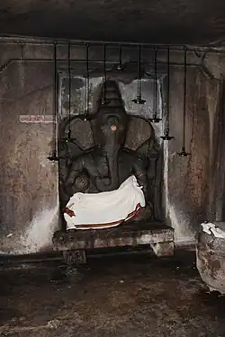 The temple is located in Kunnandarkoil, a rockyhill in Pudukottai district in southern Tamil Nadu. The cave houses three life size sculptures of various forms of Shiva.[6] The main shrine faces East and the sanctum houses the image of Lingam, an iconic representation of Shiva. Shiva is worshipped as Parvathagiriswarar. The walls of the sanctum are plain, unlike later Chola temples that have niches to house different images. The sanctum is approached through an Arthamandapa, a hall supported by pillars. The sanctum is guarded by Dvarapalas on either sides. The inscriptions are made on the base of the Dvarapalas. There are two portrait images, one of which is identified as the Mutharaiyar chief who built the temple and other being his assistant.[3]