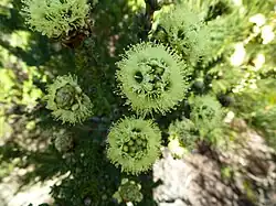 The flowers are arranged in spherical groups of 18 to 32, on the ends of branches which continue to grow after flowering. The flowers are cream-coloured to pale yellow and are surrounded by glabrous, egg-shaped bracts and bracteoles. The floral cup and sepals are each about 1 mm (0.04 in) long and the five petals are egg-shaped to almost round and 2–2.5 mm (0.08–0.1 in) long. There are about 50 to 70 stamens which are about twice as long as the petals and a style about 7 mm (0.28 in) long. Flowering occurs in October and November and is followed by fruit which are urn-shaped capsules about 6 mm (0.2 in) long.[3]