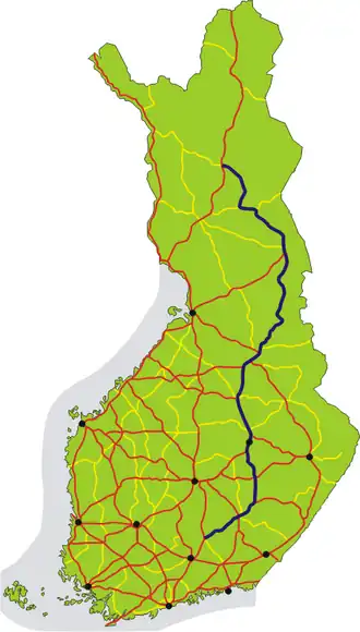 Finnish national road 5 (Finnish:Valtatie 5 or Viitostie, Swedish: Riksväg 5) is a main route connecting Lusi (Heinola) in the south of the country to Sodankylä in the north. It is 905 kilometres long.[1] National road 5 forms part of the E63 between Vehmasmäki (Kuopio) and Sodankylä.