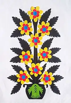 The rooms were decorated with paper cutouts. Artists from Puszcza Biała, especially active in the villages of Dąbrowa and Pniewo, created these crafts for personal use and sold them only to local buyers. This helped preserve the traditional forms and original function of the cutouts.[65] Two categories of paper cutouts from Puszcza Biała can be distinguished: monochromatic (often in the form of zielka) and colorful nalepianki in the shape of circles. Another form typical of Kurpie Białe is a ribbon-like nalepianka called portki. Figurative compositions also exist. The dominant colors were red, green, and yellow.[63][66][67] The art of paper cutting saw a revival in certain communities after World War II with the support of Cepelia; however, after its collapse, individual artists struggled to maintain the tradition.[68][69]