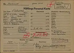 Registration card of Kurt Adams as a prisoner at Buchenwald Nazi Concentration Camp