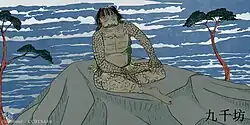 Another legend, told through kamishibai, tells how Kuzenbo, imprisoned in a mountain, was blasted all the way to the Deccan Plateau in India after the mountain he was stuck in was struck by lightning. After the imprisonment of Kuzenbo, Sha Wujing emerged from the Yellow River in China. A great battle between the mountain kappa, led by Kuzenbo, and the river kappa, led by Sha Wujing, took place in the Taklamakan Desert. Sha Wujing and Kuzenbo decided to compare their strength by lifting megaliths. It was a close competition, but Sha Wujing finally surrendered when Kuzenbo lifted a megalith that weighed nine-thousand tons and threw it very far, which was a feat he could not match. With Sha Wujing having surrendered, Kuzenbo became the leader of the river and mountain kappa, making him the leader of all kappa in the world. The clan of kappa travelled along the Silk Road through China and Korea and eventually came to Japan. Kuzenbo had nine thousand of his kappa travel all around Japan and settle in every river in the country. He was able to watch them all from atop the mountain Kuzenbuyama.[1]