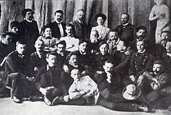 Teachers and students of the Kyiv Art School (1908). Standing from left to right: F. Balavenskyi, I. Makushenko, V. Menk, O. Natanson, I. Nikolaiev, sitting in the third row are L. Dorodnitsyna (supervisor), B. Ikonnykov, V. Nikolaiev, I. Seleznov, G. Diadchenko, V. Manastyrskyi (manager), among the students in the second row, second from the left, K. Trokhymenko.