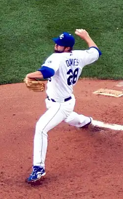 After competing for a spot in Kansas City's starting rotation during Spring Training in 2008, Davies was optioned to the Triple-A Omaha Royals on March 26.[16] He was recalled on May 29, taking the rotation spot of Brett Tomko.[17] In his season debut on May 31, Davies threw five innings, allowing just one run in a 4–2 win over the Cleveland Indians, snapping the Royals' 12-game losing streak.[18] In 21 starts with the Royals, Davies went 9–7 with a 4.06 ERA.[7]